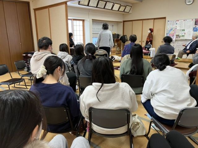 昨年に続き、学校から程近い中野島公民館を訪問し、毎週水曜日の午後に開催されている介護予防ふれあいサロン「中野島いきいきの会」に参加させていただきました。参加者は60~90歳代の地域住民の方々約15名で、学生を温かく迎えてくださいました。