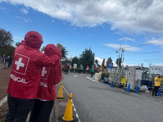 当日は、フィニッシュ第1救護所、フィニッシュ第2救護所に参加しました。活動内容は、ゴールしたランナーの誘導、テーピングやアイシング、ストレッチングなどを行いました。救護所内では、転倒による怪我への対応を補助したり、体調を崩し救護所内でも変化する体調に対応するためランナーに声をかけたりする中で、医師や看護師、行政職員との報告・連絡・相談を見学し、一部経験もさせていただきました。